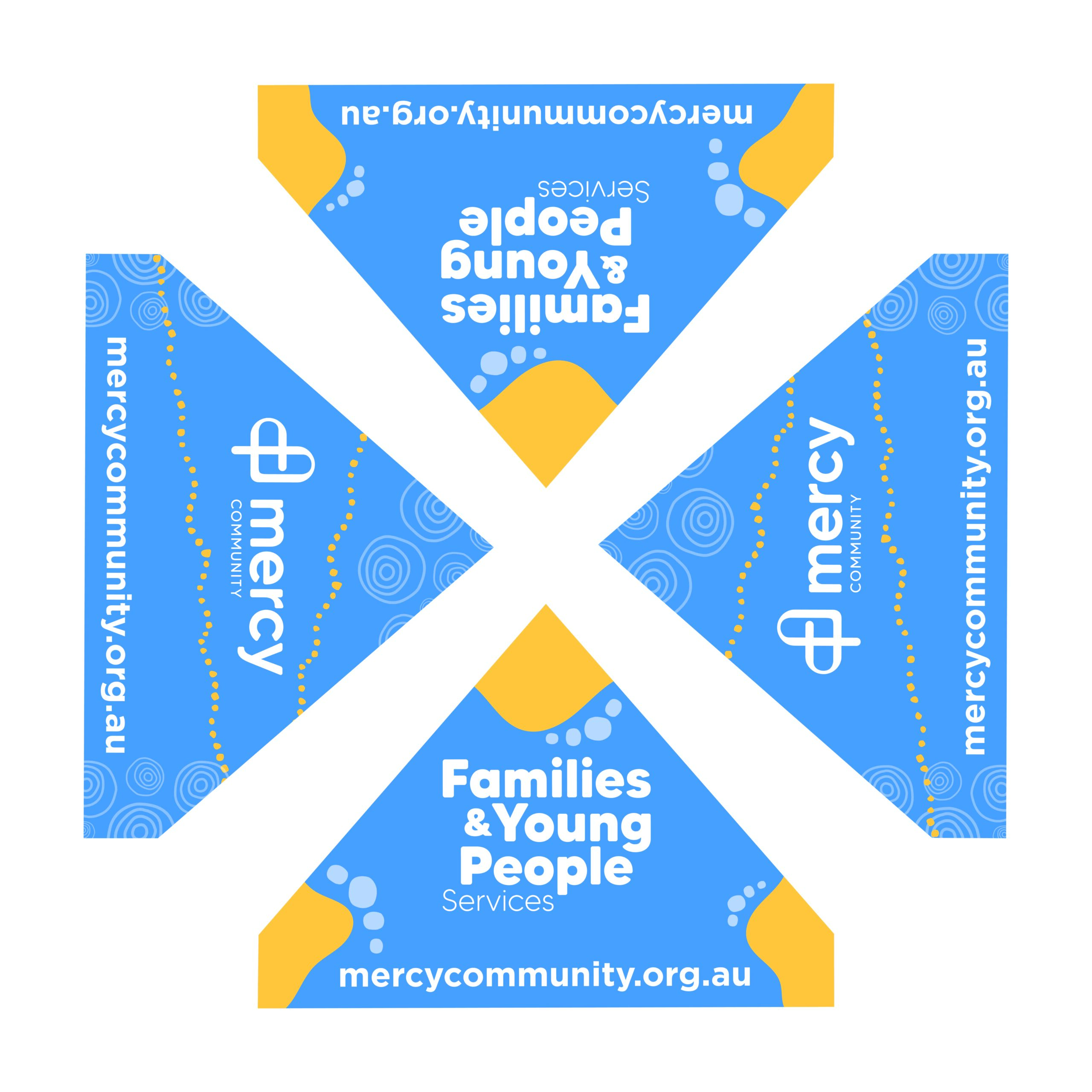 3x3m OZtrail marquee with Mercy Community branding and First Nations artwork.